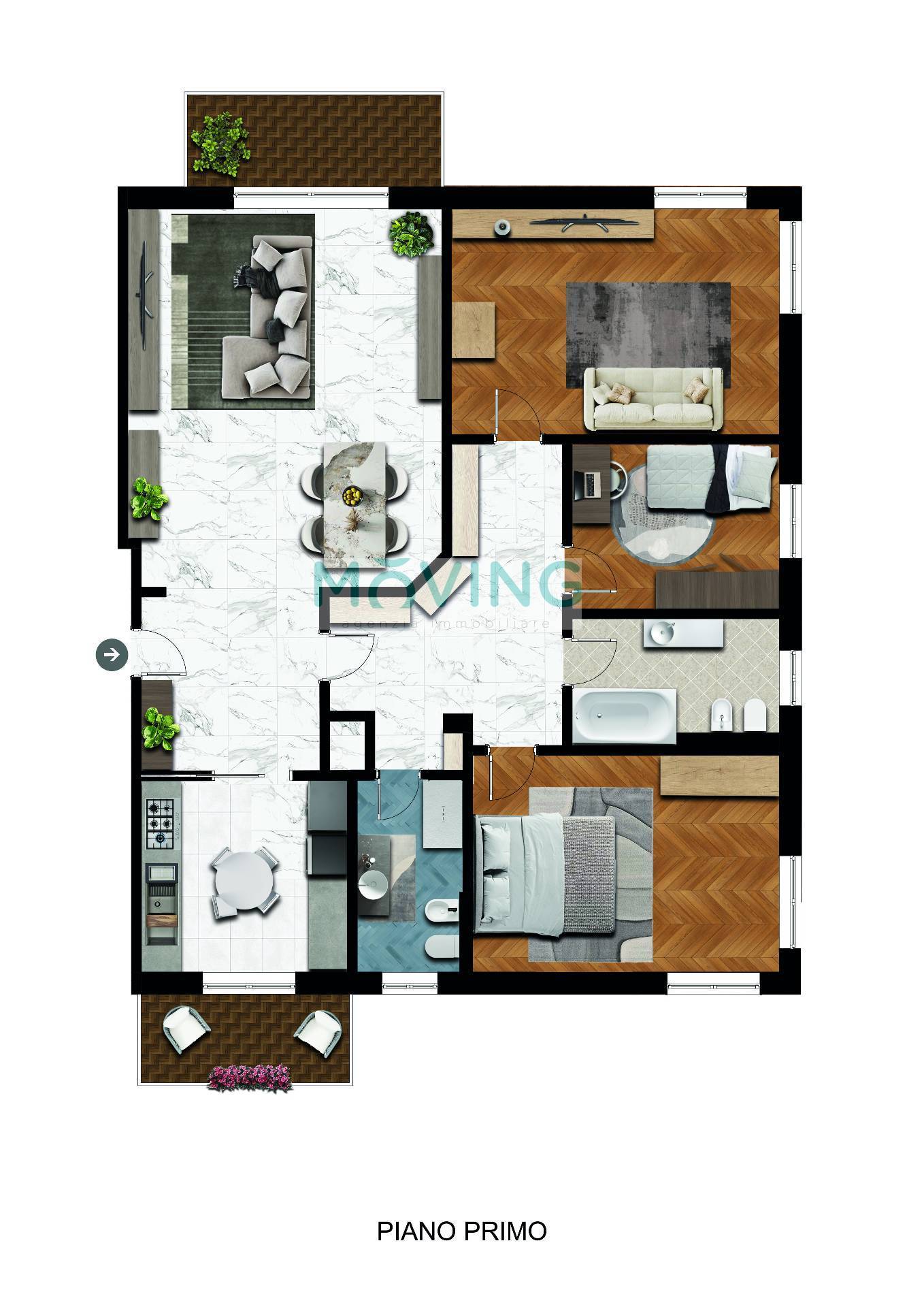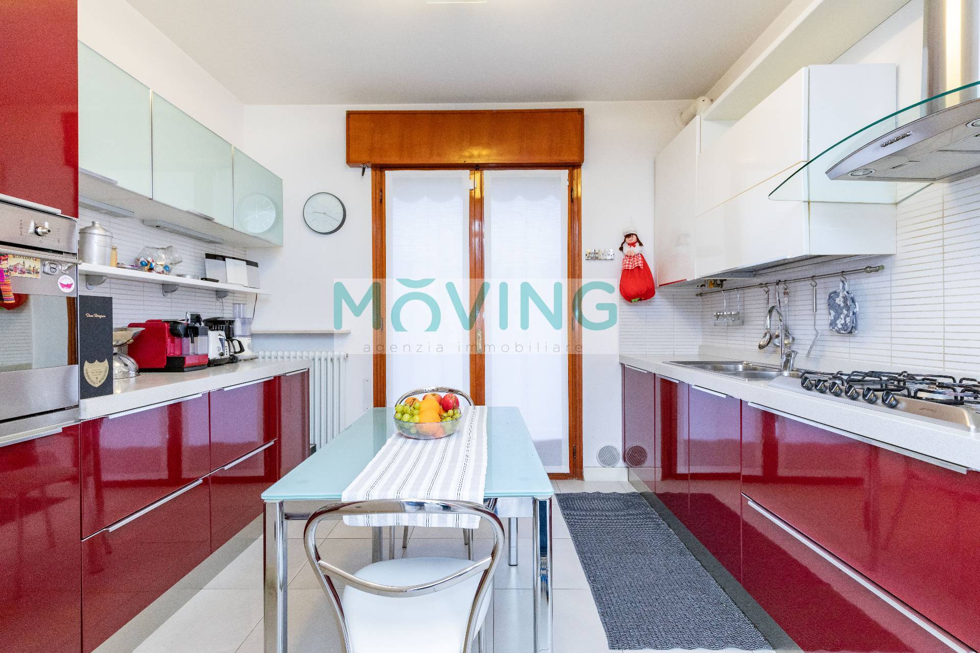 L’ingresso si apre su un soggiorno di circa 30mq, il vero cuore della casa, affacciato sulla terrazza, con una piacevole vista. La cucina abitabile, spaziosa e conviviale, gode di un pratico accesso al poggiolo.