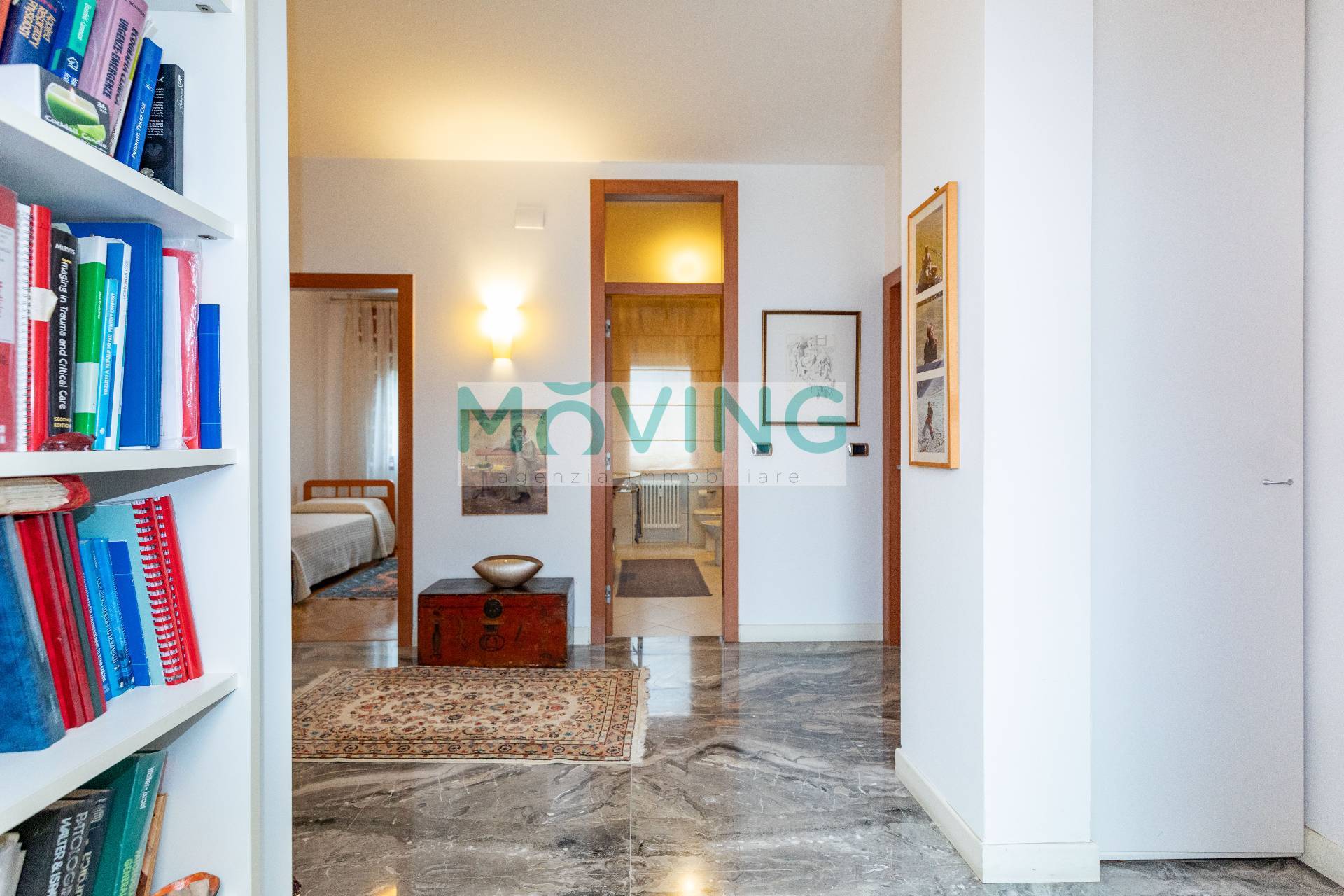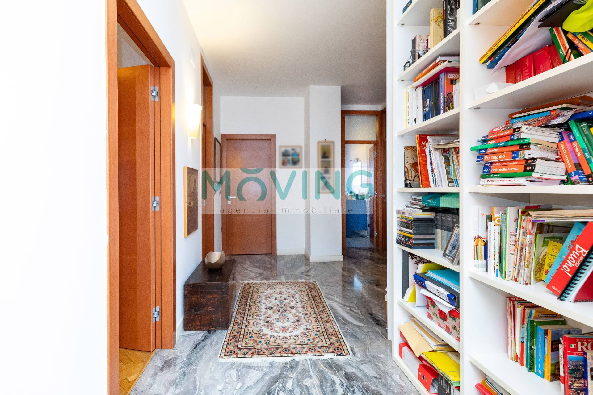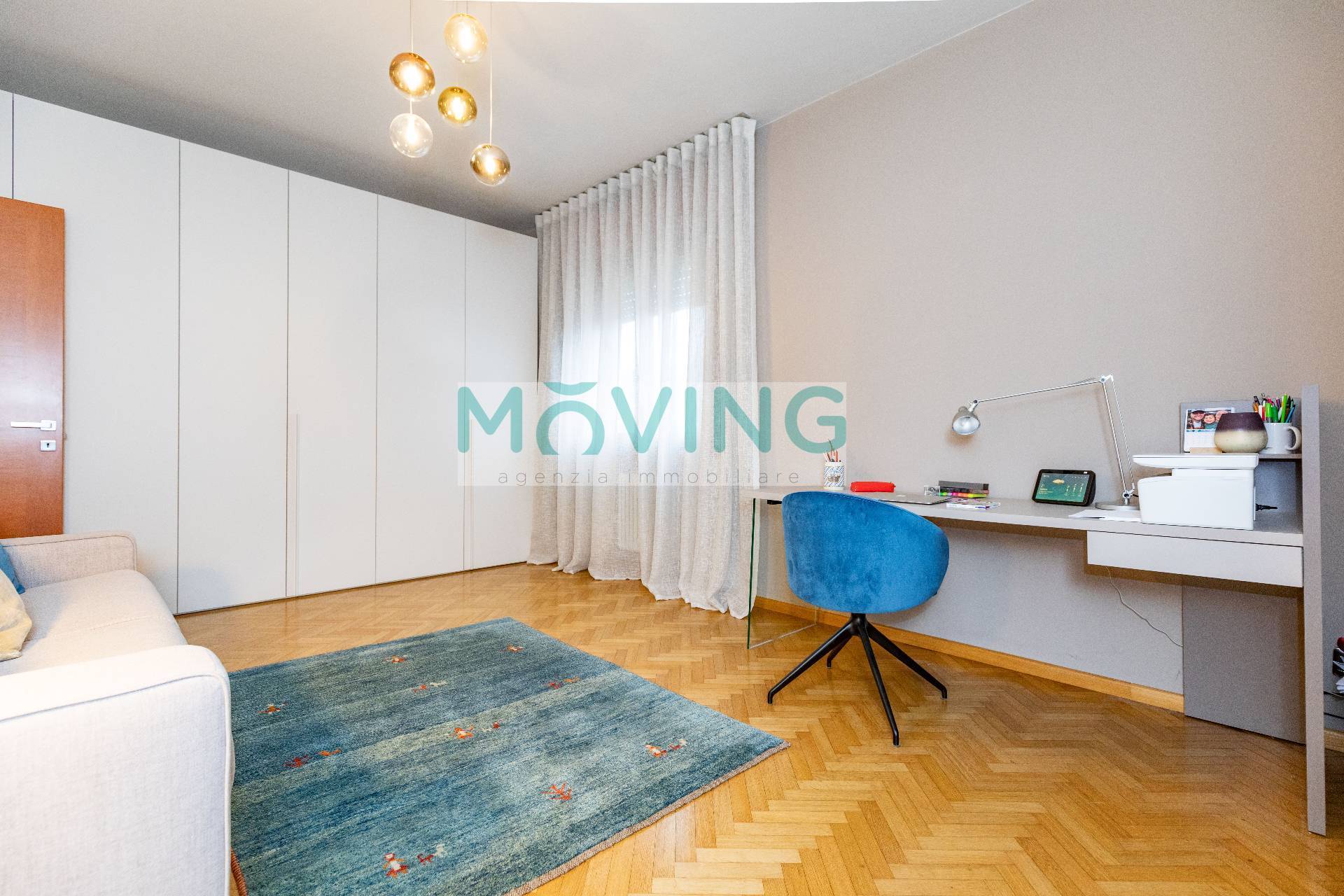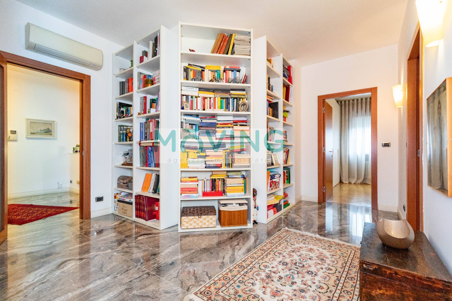 La zona notte, ben separata, regala privacy e tranquillità: due camere matrimoniali grandi e accoglienti, una terza camera o studio, un disimpegno impreziosito da una libreria su misura che racconta attenzione al dettaglio, doppi servizi finestrati e un utile ripostiglio.